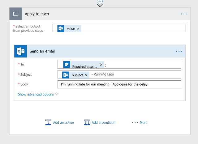 - Once we have integrated the information for the meeting we are running late to, the next step is to add a “Send Email”