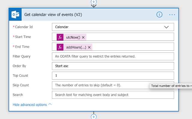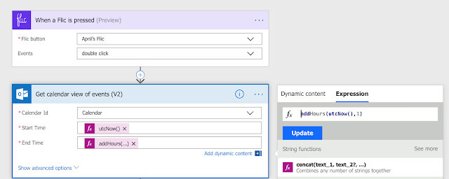 - For a start time we will add an Expression with UTCNow() to get the current date/time at button press. For End Time we will add an expression to get the current date/time plus 1 hour.