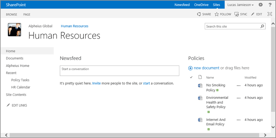 This area displays the content in the selected page. The home page in our example above, contains a simple Newsfeed. Also it contains a list of documents stored in document library named "Policies". The sites do not have to be overly complicated. The aim to have collaborative point with relevant and useful content.
