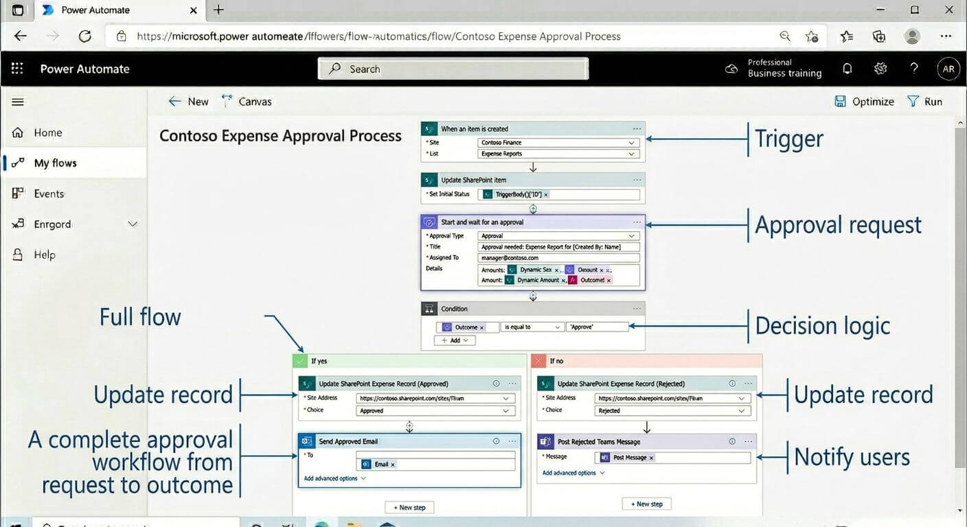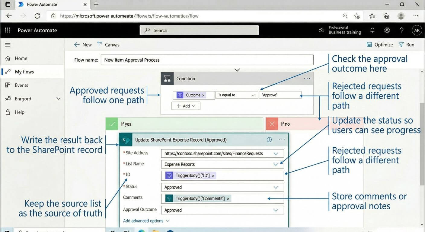 Let’s walk through a common scenario: a SharePoint list stores approval requests, and when a new item is added, Power Automate sends an approval request to a manager. Once a decision is made, the list item updates and the requester is notified.