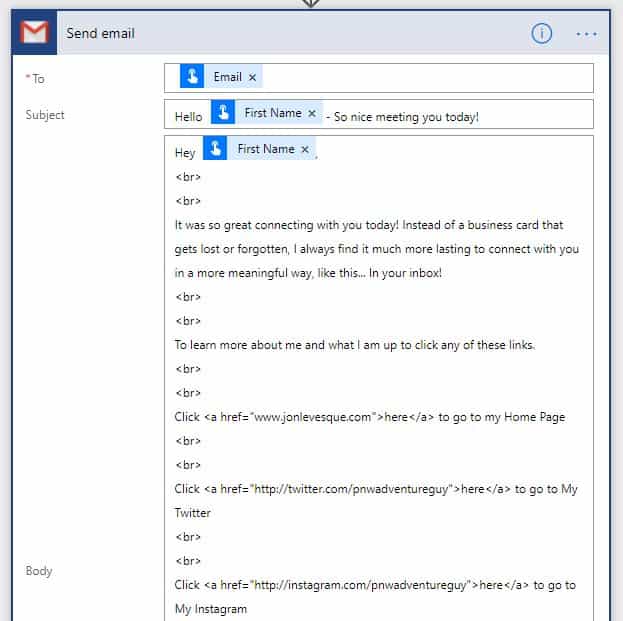 The above steps focus on setting up the capture for the connection’s information. The following steps will focus on sending them a follow up “nice to meet you” email.