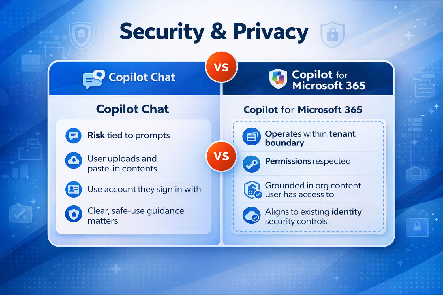 Copilot Chat is often used for drafting and summarising from user-provided inputs. That changes the risk profile: the biggest risk is not Copilot “accessing everything.” The biggest risk is a user pasting sensitive data into a prompt without thinking. That is why a one-page safe use guide and short user training makes such a difference.