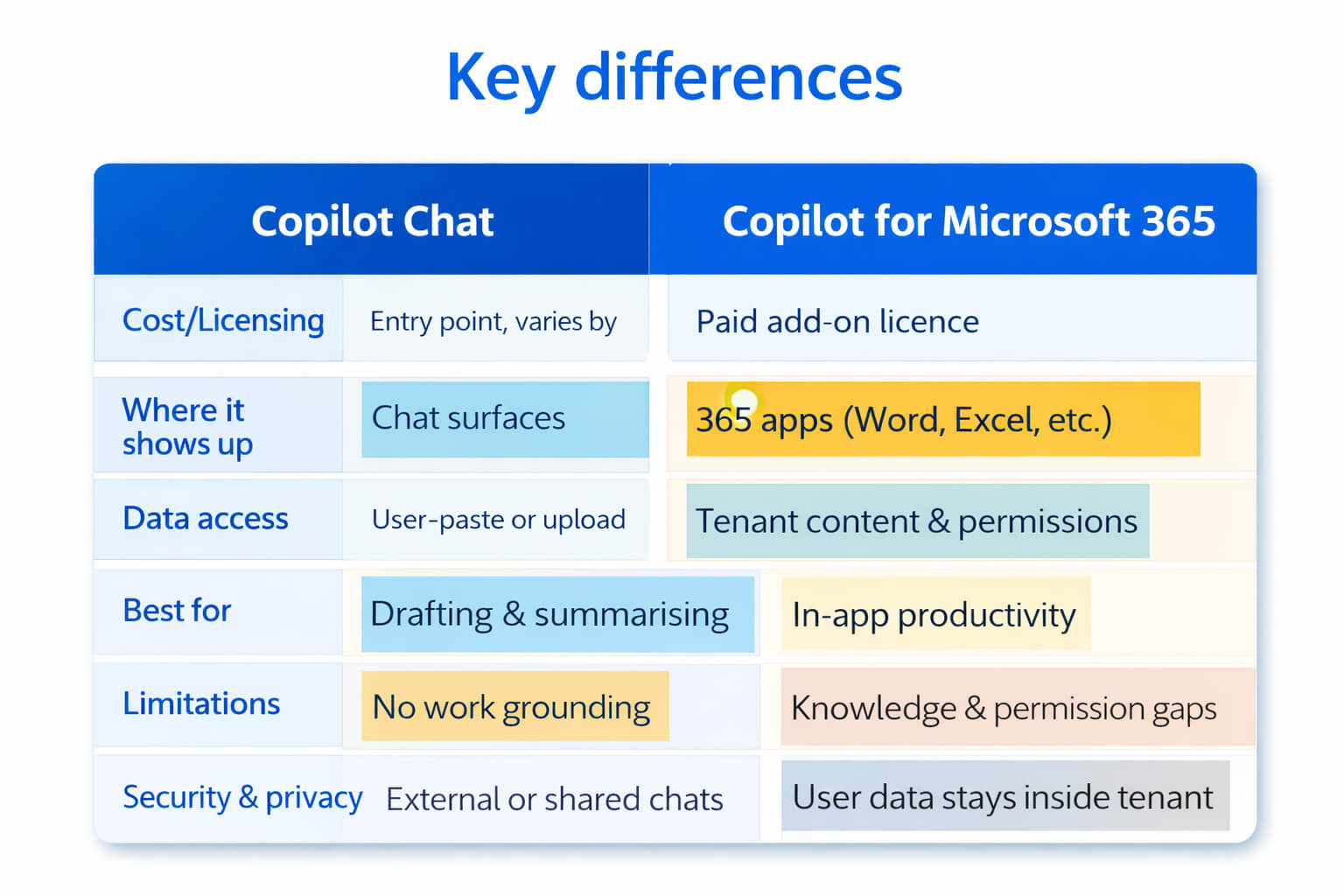 4) Upgrade when context matters: if the use case depends on internal emails, meetings, chats and files, Copilot Chat alone will feel limited.