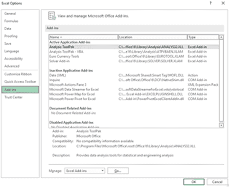 - In the manage box in the bottom section, select Excel Add-ins and then click Go.
