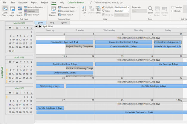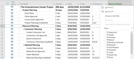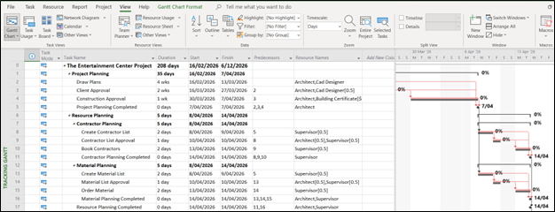 Make use of the many views within Project to oversee the tasks and resources based on your convenience. Use the View ribbon, turn-split view on or off and quickly change views by right click on the view bar. This appears as a thin panel on the left side of the screen with the view name).