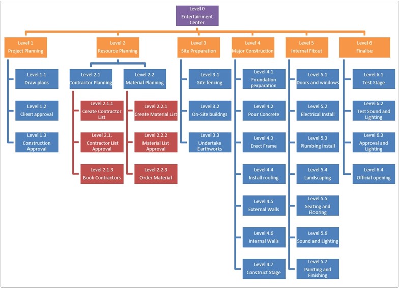 To use a WBS, you create the breakdown of your project into smaller manageable pieces and end up with a diagram such as the one below. The WBS technique allows you to break the project down until you can identify for any one task what is required to accomplish that task (time, resources, cost, etc.).
