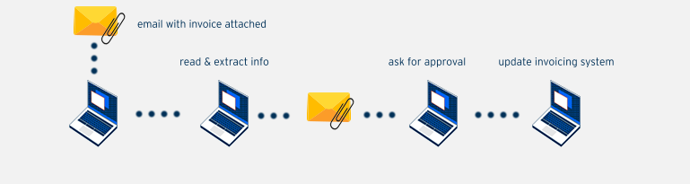 The illustration above shows a typical procedure for receiving and processing invoices. With Power Automate, you have the ability to filter emails with attachments and a subject line that includes "invoice". The invoice can be saved automatically, and the information can be interpreted and stored using AI capabilities. An approval form can then be triggered and emailed to relevant managers to get approval. Once approved the invoicing system is updated automatically!